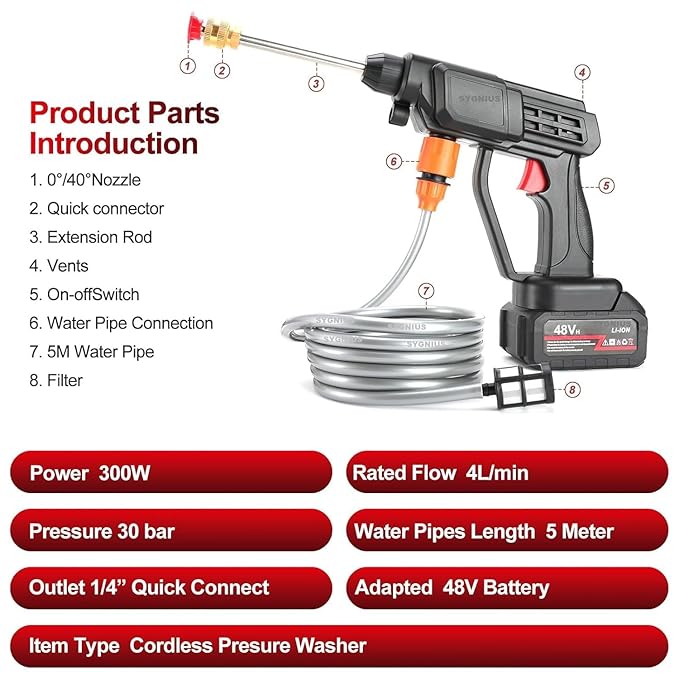 - Lightweight and easy to assemble – This high pressure cordless washer is comes with a 5M hose that are easy to store. Compared with traditional washing machines, our cordless pressure washer are lighter and more portable. Just spent a few minutes to complete the installation and start your work.